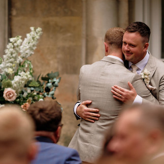 As guests arrived, they were greeted by the sight of the stunning courtyard, bathed in sunlight just at the right moment and beautifully adorned with floral arrangements from their wonderful friend and florist who has seeked refuge with their family from Ukraine and has become a much treasured member of the family. The atmosphere was warm and inviting, with the soft rustling of leaves and the gentle hum of anticipation in the air whilst the crowd of loved ones eagerly awaited Katie’s entrance.
